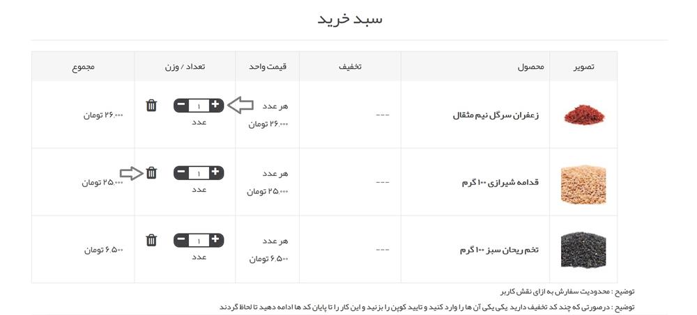دراینجا میتوانیم ضمن مشاهده محصولاتی که انتخاب کرده ایم مجددا تعداد آنها را اضافه یا کم کنیم و در صورت نیاز از لیست خود حذف کنیم.